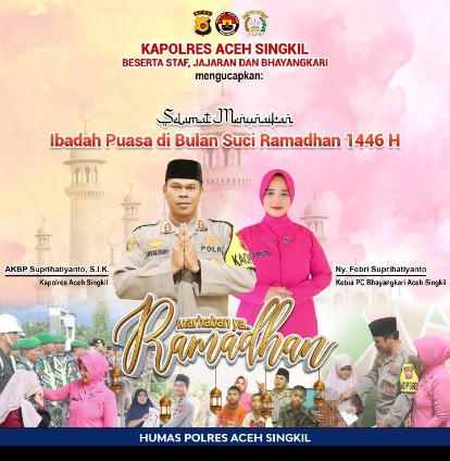 Aceh Singkil | DetikAceh.com ~ Dalam menyambut bulan suci Ramadhan 1446 H/2025 M, Kapolres Aceh Singkil, AKBP Suprihatiyanto, SIK, bersama Ny. Febri Suprihatiyanto selaku Ketua Bhayangkari Aceh Singkil, serta seluruh staf, jajaran, dan anggota Bhayangkari, menyampaikan ucapan selamat menunaikan ibadah puasa kepada umat Muslim.