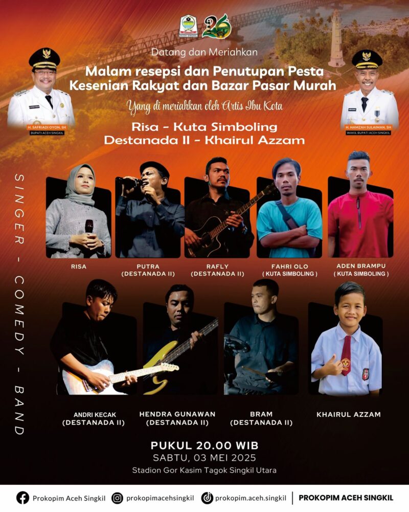 Malam penutupan ini dipastikan akan menjadi pesta rakyat yang tak terlupakan, menghadirkan serangkaian hiburan istimewa dari sejumlah musisi dan seniman ternama aceh singkil. Masyarakat akan dihibur oleh penampilan memukau dari RISA Kuta simboling, Khairul Azam, Destanada II Putra Destanada II, Andri Kecak Destanada II, Hendra Gunawan Destanada II, dan Bram, serta kehadiran bintang-bintang lokal seperti Fahri Olo, Aden Brampu,