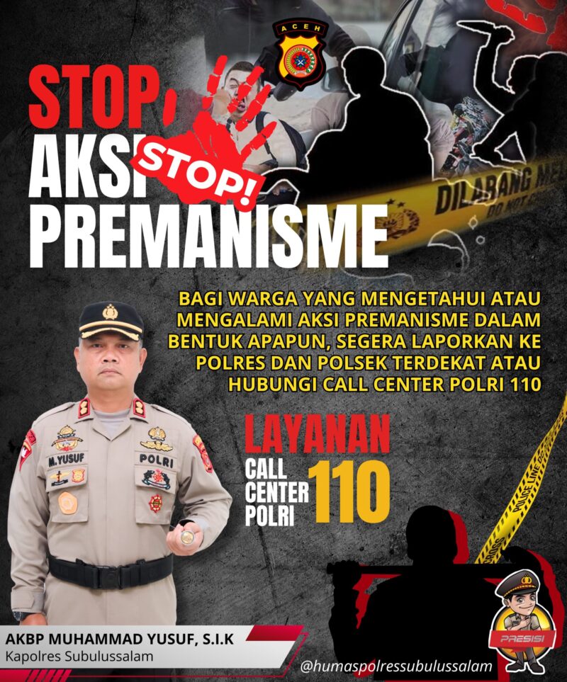 Bagi warga yang mengetahui atau mengalami aksi premanisme dalam bentuk apapun, segera laporkan ke Polres atau Polsek terdekat atau hubungi layanan Call Center Polri 110,”ujar Muhammad Yusuf.