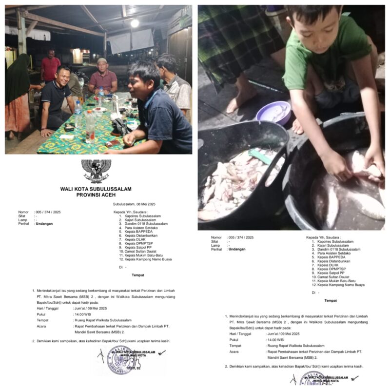 Lebih lanjut Kepala Mukim Binanga Kec. Rundeng, kota Subulussalam itu mengungkapkan masyarakat sudah lelah kemana lagi harus mengadu terkait dugaan pencemaran air itu, ” naifnya kenapa kepala Mukim kemukiman Binanga dan kepala Kepala Kampong Muara Batu-batu tidak di undang oleh Pemko Subulussalam perihal Rapat Pembahasan Terkait Perizinan dan Dampak Limbah PT Mandiri Sawit Bersama ( MBS ) 2 hari ini Jum’at, 9/5/2025 pukul. 14.00 Wib di Ruang Rapat Walikota Subulussalam;