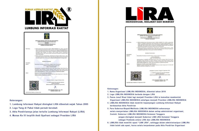 “Ini bukan soal rivalitas organisasi, tapi soal keabsahan hukum. Kami menegaskan bahwa hanya LIRA di bawah kepemimpinan Andi Syafrani yang memiliki hak legal atas nama dan atribut Lumbung Informasi Rakyat. Kami harap pihak-pihak yang tidak memiliki dasar hukum untuk berhenti mengklaim nama dan logo LIRA secara sepihak,” tegas Saleh mengakhiri pernyataannya.