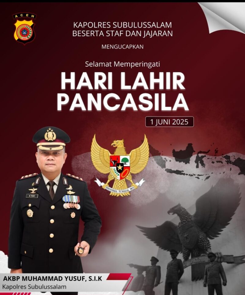SUBULUSSALAM, Detikaceh.com ~ Pada Minggu 1 Juni 2025, Di tengah peringatan Hari Lahir Pancasila yang ke-80 tahun ini, Kapolres Subulussalam, AKBP Muhammad Yusuf S.IK., beserta seluruh jajaran staf dan personel, menyampaikan ucapan selamat dan seruan penting kepada seluruh masyarakat. Momentum delapan dekade Pancasila ini menjadi pengingat akan esensi dan relevansinya sebagai pilar utama bangsa Indonesia.