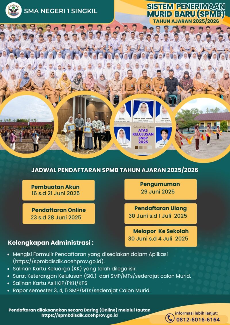 Dan Tata Cara daftar Ulang bagi Murid yang dinyatakan lulus pendaftaran di SMA negeri 1 Singkil dapat melakukan registrasi ulang pada laman SPMB: https://spmbdisdik.acehprov.go.id sesuai dengan jadwal yang telah ditetapkan.