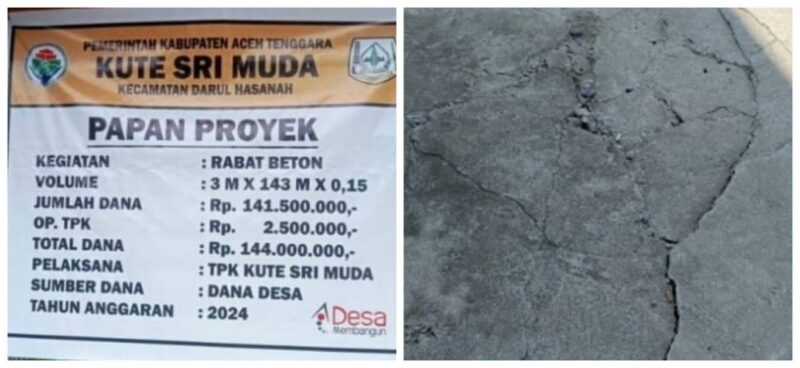 Proyek sepanjang 143 meter dengan lebar 3 meter ini dibiayai dari Dana Desa (DD) Tahun Anggaran 2024 sebesar Rp144 juta. Namun belum lama selesai, sejumlah titik pada rabat beton sudah mengalami kerusakan yang kasat mata: retakan memanjang, permukaan yang mengelupas, hingga bagian pinggir yang runtuh seolah dikerjakan tanpa perhitungan matang.