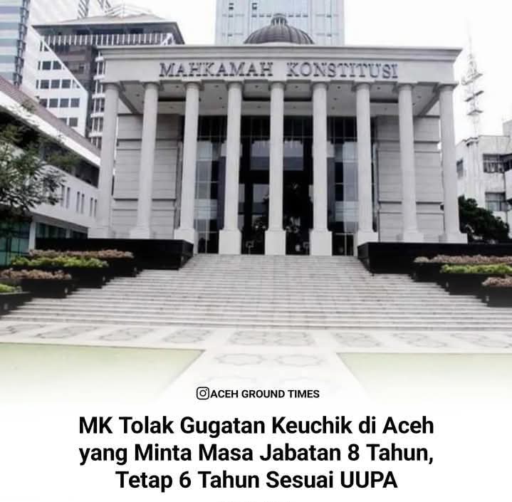 Jakarta |detikaceh.com. Putusan MK yang menolak permohonan uji materi Pasal 115 ayat (3) UU Pemerintahan Aceh yang diajukan oleh lima keuchik dari Aceh. Dengan demikian, masa jabatan keuchik di Aceh tetap enam tahun dan dapat dipilih kembali untuk satu kali masa jabatan berikutnya.
