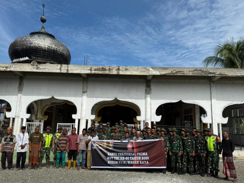 Ratusan personil Batalyon infanteri Yonif 856 TP/ satria Bumi sakti melaksanakan kegiatan sosial Gotong Royong massal bersama Personil Koramil Beutong di Masjid Hajar Aswad Desa Ujong Blang Kecamatan Beutong Kabupaten Nagan Raya Provinsi Aceh.