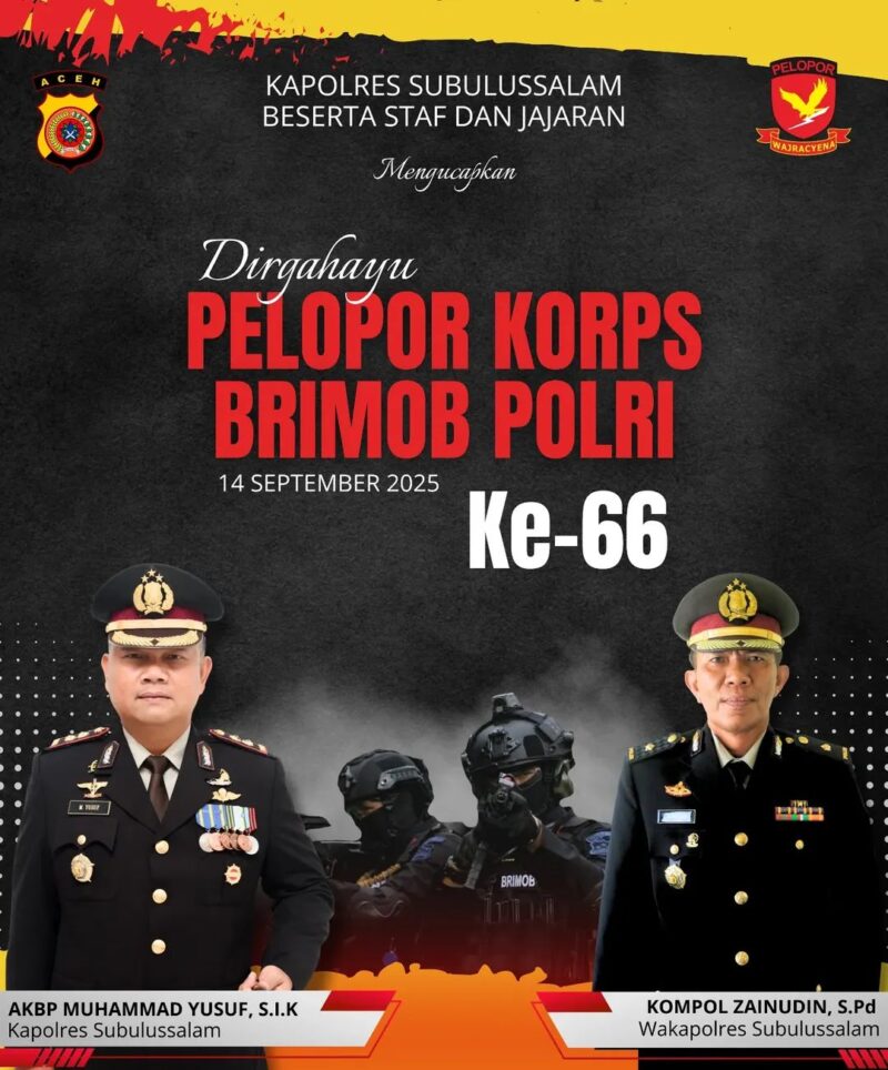 Subulussalam – Kepala Kepolisian Resor (Kapolres) Subulussalam AKBP Muhammad Yusuf, S.I.K bersama Wakapolres Kompol Zainudin, S.Pd, beserta seluruh staf dan jajaran, menyampaikan ucapan selamat dirgahayu ke-66 untuk Pelopor Korps Brimob Polri yang jatuh pada tanggal 14 September 2025.