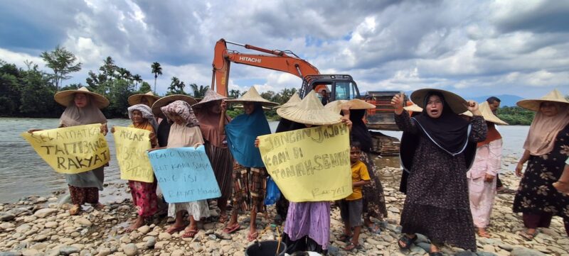 Aceh Barat : Warga dari sejumlah gampong di Kecamatan Pante Ceureumen, Aceh Barat melakukan aksi di pingir sungai Gampong Ketambang, Kamis (2/10/2025) siang. Aksi yang didominasi kaum wanita ini menolak ditutupnya tambang menggunakan beko/ alat berat excavator.