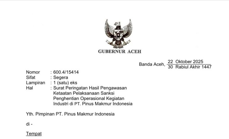 Surat peringatan kepada PT. Pinus Makmur Indonesia bernomor 600.4/15414 tertanggal 22 Oktober 2025, dan ditandatangani langsung oleh Gubernur Aceh. Dalam dokumen tersebut disebutkan bahwa PT. Pinus Makmur Indonesia, yang beroperasi di Kabupaten Gayo Lues, melanggar sejumlah ketentuan lingkungan hidup sebagaimana tertuang dalam Keputusan Gubernur Aceh Nomor 500.4/741/2025 tanggal 28 April 2025. Pelanggaran yang ditemukan mencakup absennya beberapa perizinan teknis krusial, seperti Surat Kelayakan Operasional (SLO) terkait Instalasi Pengolahan Air Limbah (IPAL), Persetujuan Teknis (Pertek) emisi udara, dan Rincian Teknis (Rintek) penyimpanan limbah Bahan Berbahaya dan Beracun (B3).