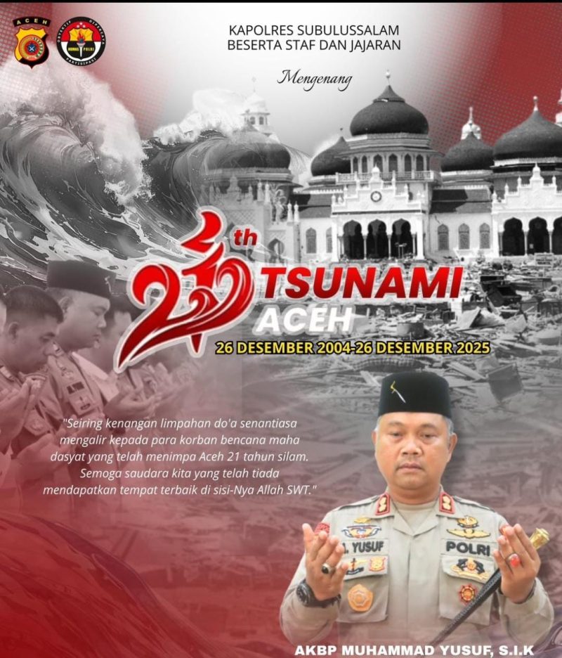 Subulussalam –detikaceh.com Peringatan 21 tahun tragedi gempa dan tsunami Aceh, 26 Desember 2004, menjadi momentum refleksi mendalam bagi masyarakat Aceh. Di tengah suasana khidmat tersebut, sosok Kapolres Subulussalam AKBP Muhammad Yusuf, S.I.K. tampil sebagai figur pemimpin yang tidak hanya menjalankan tugas keamanan, tetapi juga menghadirkan empati dan doa bagi para korban bencana maha dahsyat itu.