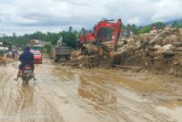 ACEH TENGGARA | Balai Pelaksanaan Jalan Nasional ruas batas Gayo Lues- Kutacane- Batas Sumut, Terlihat sedang mengangkat sedimen material dan kayu banjir bandang…